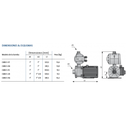 Envolvente exterior, cuerpo impulsión, impulsores, filtro y envolvente motor en AISI 304. Eje bomba en AISI 431. Difusores en tecnopolímero. Cierre mecánico en óxido de alúmina/ grafito/NBR/AISI 304 y esteatita/grafito/ NBR/AISI 304